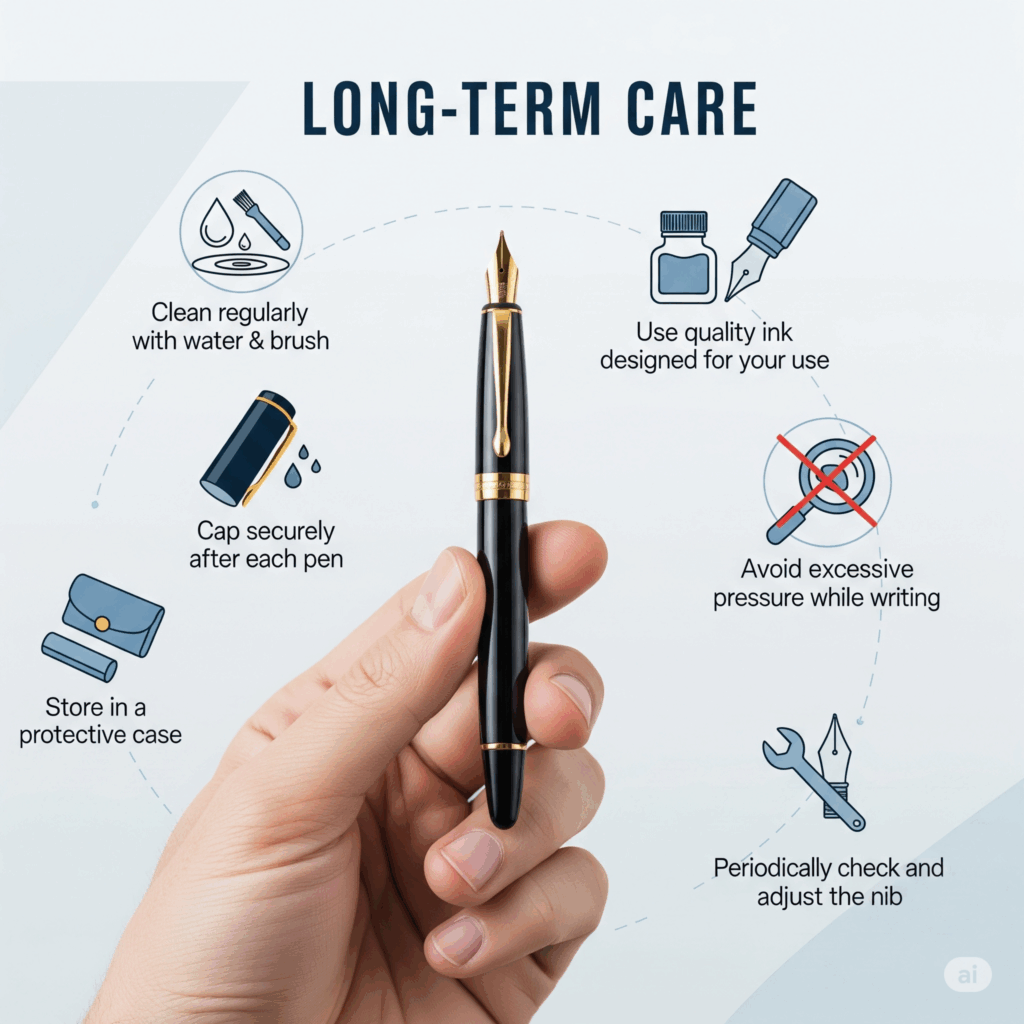 - ปิดฝาให้สนิททุกครั้ง: หลังจากใช้งานปากกาเสร็จแล้ว ควรปิดฝาหรือกดเก็บหัวปากกาให้สนิททุกครั้ง เพื่อป้องกันไม่ให้หัวปากกาแห้งและหมึกไม่ไหลออกมาเลอะเทอะ